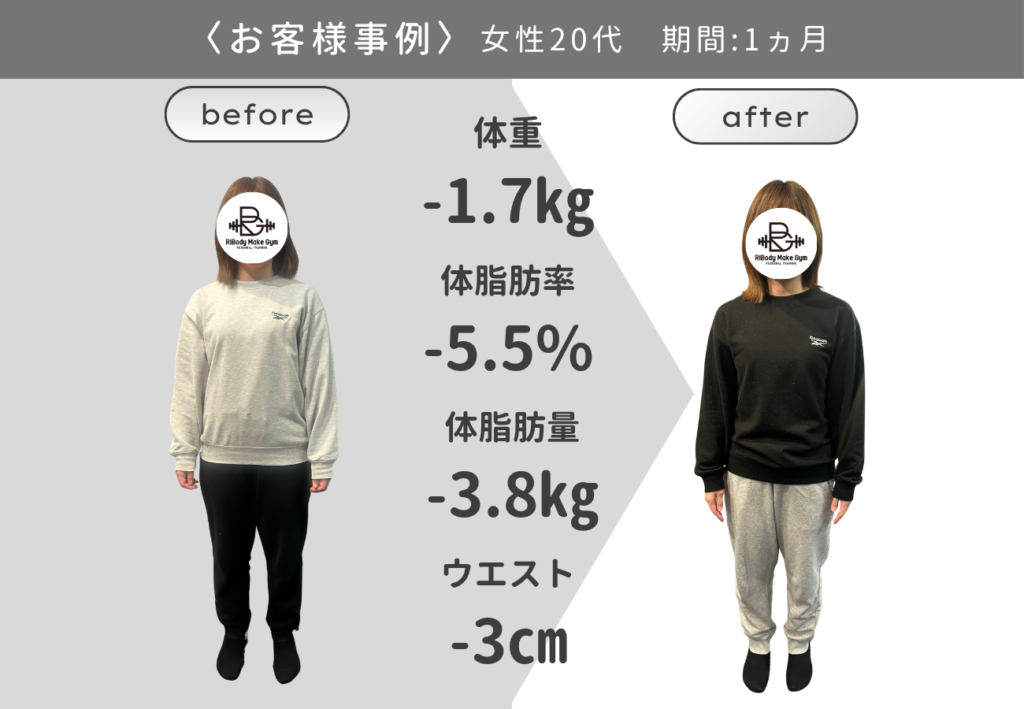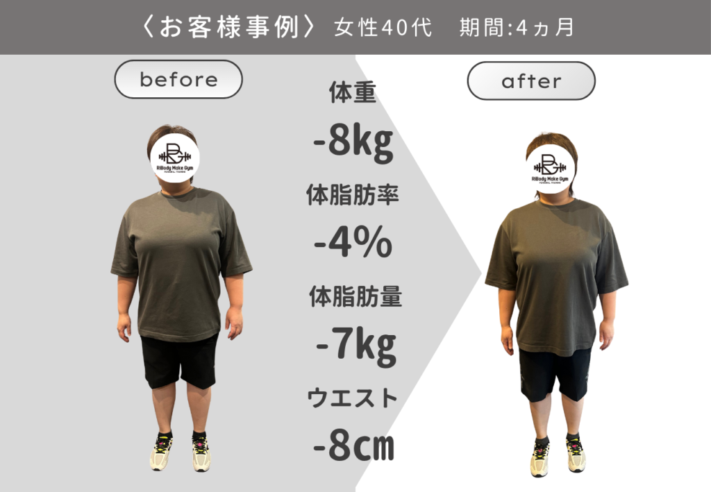 RiBody Make Gymのダイエットプログラムは、「ただ体重を減らす」ことではなく、リバウンドの不安を根本から解消し、健康的に引き締まった体をつくることを目的とした結果直結型のトータルサポートを提供します。